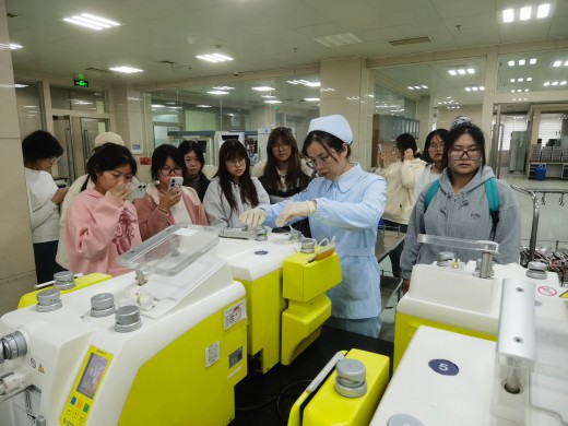 在工作人员的引导下,同学们首先来到血液的“中转站”和“加工厂”——成分制备室。“捐献的全血并不能直接用于临床治疗,需要通过离心分离成红细胞、血浆、血小板等不同成分,遵循‘缺什么补什么’的原则,更精准、高效地救治患者。” 看着设备将血液“分门别类”,一袋袋加工后的血液在同学们眼中被赋予了生命的温度。